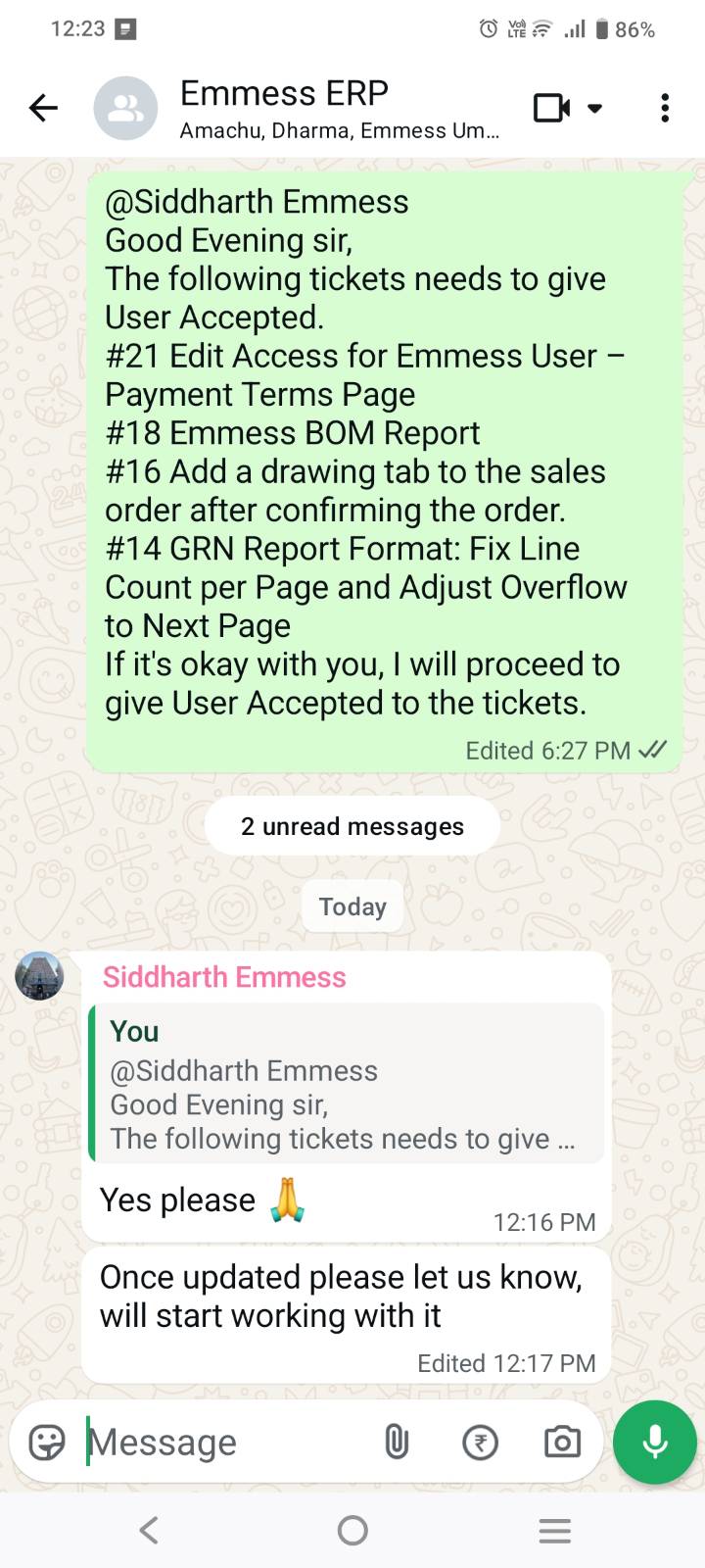 Based on the above communication via whatsapp i am putting this ticket to User Accepted , on behalf of Mr.Siddhart sir