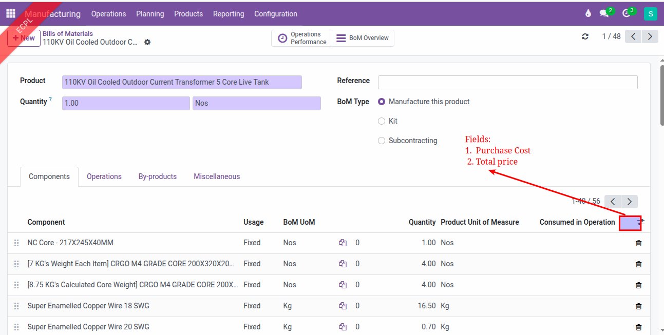 Added new fields Purchase Cost and Total Price , referring to the computation in the previous sale order. These fields are hidden in the view.