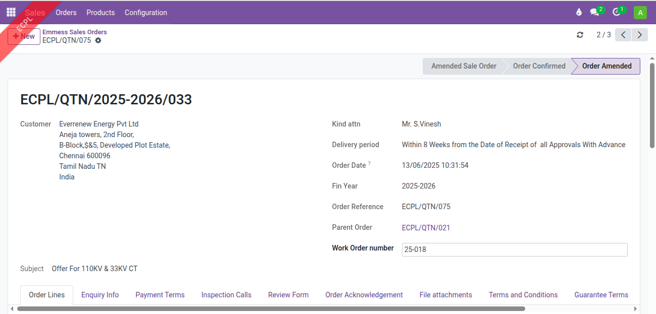 Reset ECPL/QTN/2025-2026/033 in Sales → Orders → Emmess Orders from Order Amended to Draft to add the Freight Charges.
