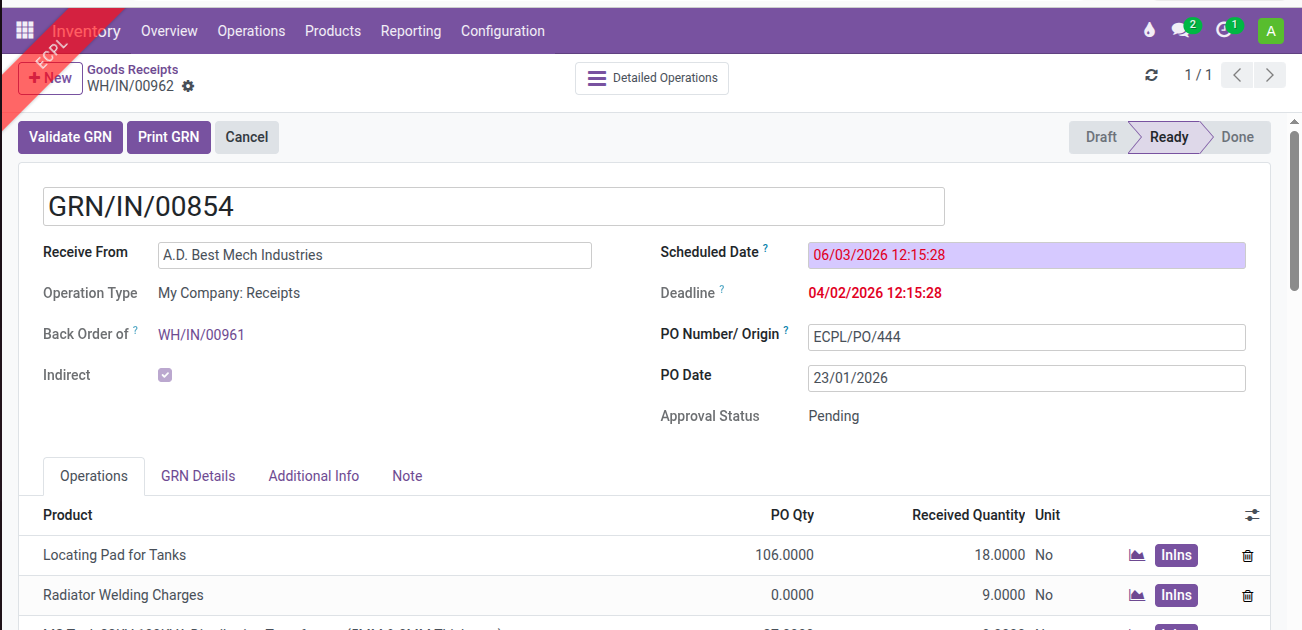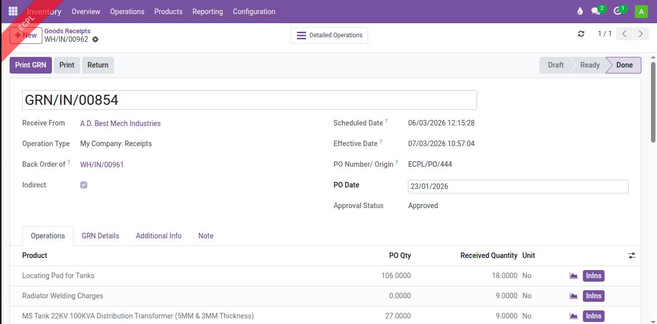 Go to Inventory → Operations → Transfers → Emmess Goods Receipts , locate GRN/IN/00854 which is in the Done state, and reset the record to Draft.