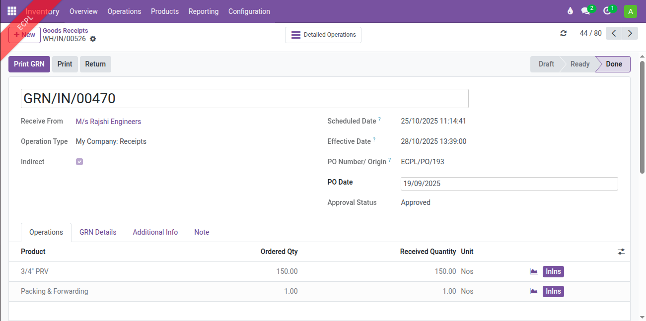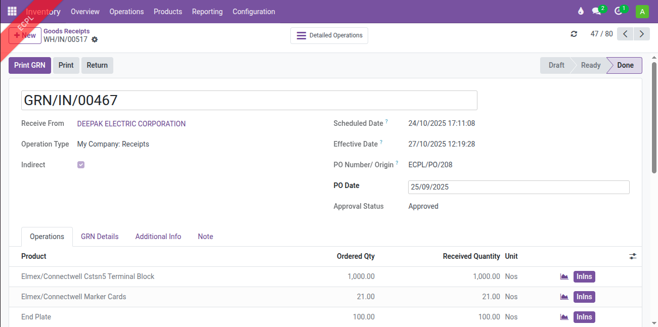 Go to Inventory โ Operations โ Transfers โ Emmess Goods Receipts, locate GRN/IN/00467 and GRN/IN/00468, which are in the Done state, and reset both records to the Draft state.