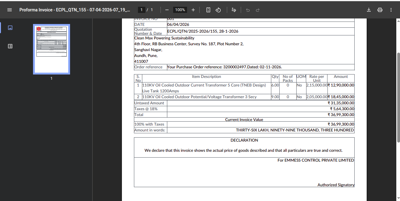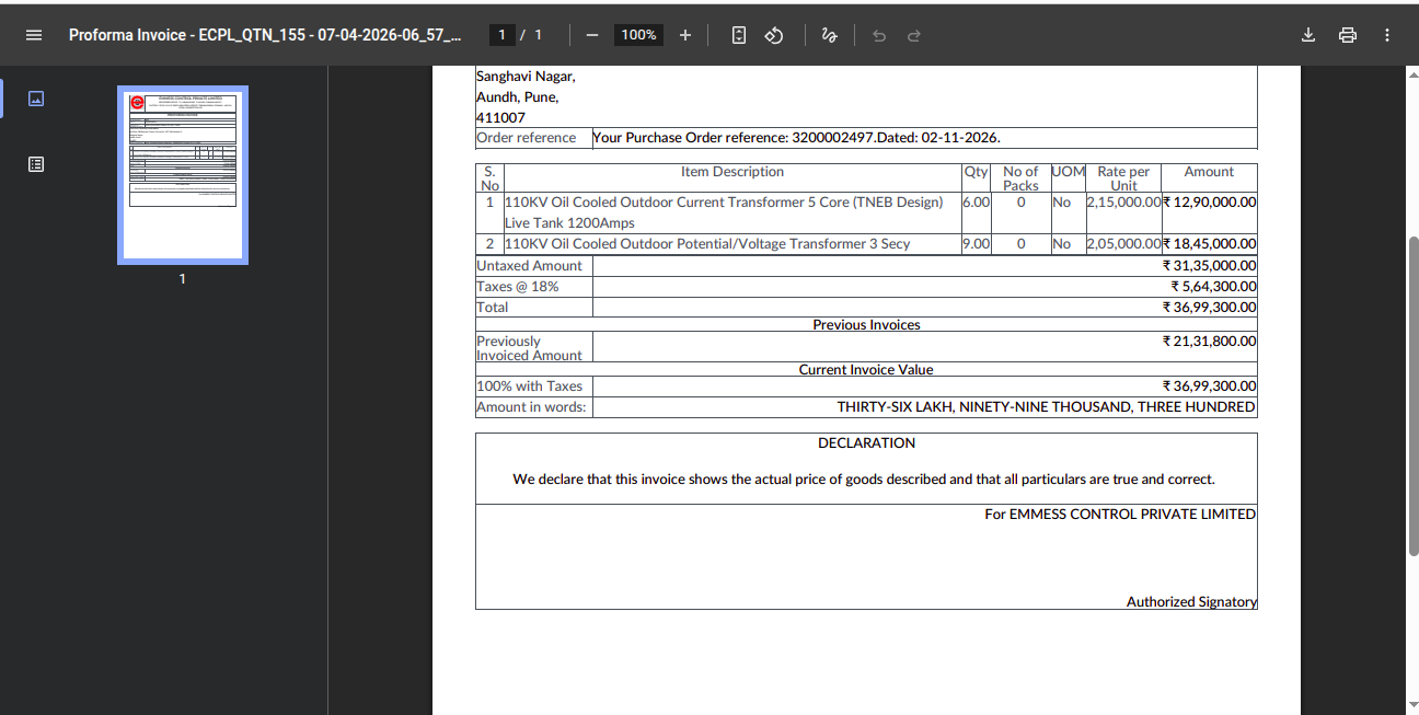 The Previously Invoiced Amount field should be hidden in the Proforma Invoice Report for ECPL/QTN/2025-2026/155. This field should not be displayed in the report output.